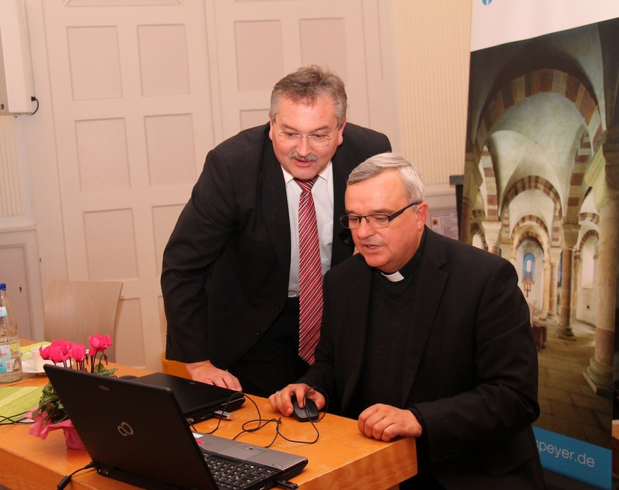 Bischof Dr. Karl-Heinz Wiesemann (rechts) schaltet die neue Internetseite des Bistums Speyer frei, assistiert von Kanzleidirektor Wolfgang Jochim.