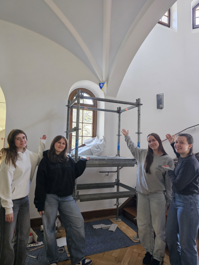 „Es ist schön die Möglichkeit zu haben, hier etwas Neues auszuprobieren.“, so Schülerin Clara. Während die Arbeit mit der Temperafarbe noch gut von der Hand ging, war der Umgang mit dem Blattgold deutlich schwieriger, berichten die Schülerinnen. So gab es zu Beginn Probleme, das Material gut zu befestigen. „Dass ausgerechnet unser Grundkurs ausgewählt wurde, ist eine besondere Ehre – wir haben uns alle sehr darüber gefreut!“, kommentiert Schülerin Enya. Damit möglichst viele Schülerinnen an den Wandmalereien mitwirken konnten, wechselten sich Vierergruppen mit den Arbeiten auf den Gerüsten ab.