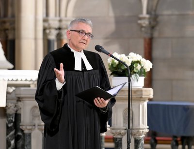 Für ihn gehöre zum Blick in die Vergangenheit aber auch „die Erinnerung an jene, die vor und während des 2. Weltkriegs Widerstand geleistet haben – viele davon aus ihrem Glauben an Gott heraus, so wie Dietrich Bonhoeffer oder Pater Alfred Delp“. Und zum Blick in die Vergangenheit gehöre die Erinnerung an alle, die sich „nach dem 2. Weltkrieg für ein anderes, von Menschenwürde, Freiheit und Demokratie geprägtes Deutschland und für ein geeintes Europa eingesetzt haben“. Durch völkerrechtswidrige Kriege, das Wiedererstarken eines völkischen Nationalismus oder durch Hass und Hetze gegenüber Ausländern werde deren Erbe heute leichtfertig mit Füßen getreten.