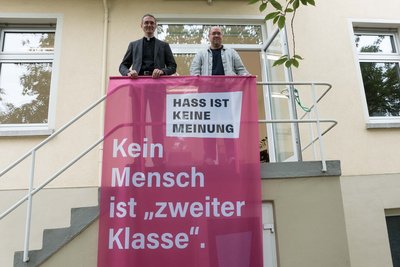 Dekan Dominik Geiger (links) und Dekan Dr. Paul Metzger präsentieren die Fahne zur Aktion „Hass ist keine Meinung“ © Prot. Dekanat/Wagner