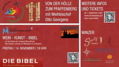 Seit Januar 2016 (in diesem Jahr gab es zwei verschiedene Präsentationen) verbünden sich in der Pfarrei Mariä Himmelfahrt Landau drei Elemente auf angenehme Weise: der Pfälzer Wein, Musik und Kunst in der Marienkirche sowie biblische und spirituelle Impulse. Die 1908 bis 1911 erbaute katholische Kirche St. Maria bietet nicht nur Glaskunst und Buntglasfenster aus dem vergangen Jahrhundert, sondern bei der jährlichen Veranstaltung „Wein – Kunst – Bibel“ auch aktuelle Kunst im Glas aus den Händen von junggebliebenen Winzern. Dabei werden Südpfälzer Weine besprochen und verkostet.