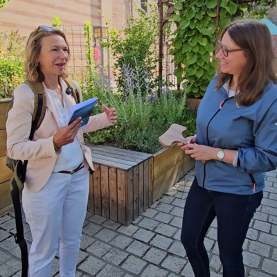 Dr. Irina Kreusch im Interview mit Luisa Vollmuth vor dem Speyerer Dom. Dr. Irina Kreusch ist Leiterin der Hauptabteilung Schulen, Hochschulen und Bildung. Für das Bistum Speyer hat sie mit einem Team der Bildungsarbeit das Projekt Staffelpilgern für das Heilige Jahr initiiert, um dem Motto "Pilger der Hoffnung" Menschen einzuladen den Weg von Speyer nach Rom zu gehen. © Bistum Speyer