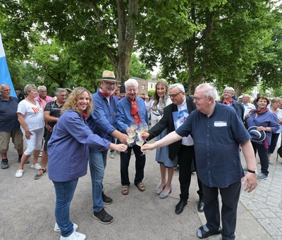 Bürgermeister Rolf Metzger überreicht die Urkunde. Ebenso auf dem Foto zu sehen Weinprinzessin Zoé I. (links von Rolf Metzger), Bischof Dr. Karl-Heinz Wiesemann, Weihbischof Otto Georgens und Pfarrer Peter Nirmaier. © Klaus Landry