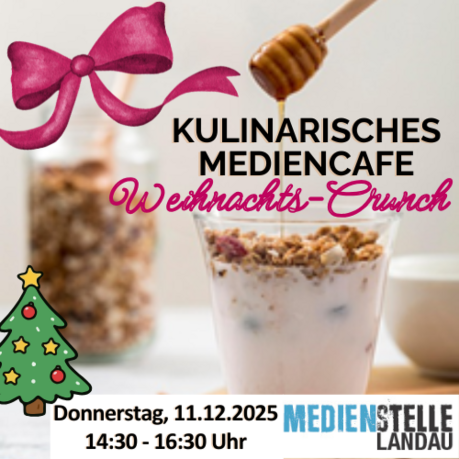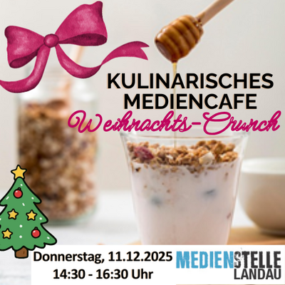 Gemeinsam Weihnachtliches Knusper-Crunch herstellen wollen wir am Donnerstag, 11.12.2025 zwischen 14.30 und 16.30 Uhr in der Medienstelle Landau - ein Mediencafé zum Jahresausklang. Pro Person entsteht ein Unkostenbeitrag von 4,00 € (bitte am Veranstaltungstag passend mitbringen). Mitzubringen sind des Weiteren: ein Behälter mit Deckel.