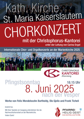 Am Pfingstsonntag, den 8. Juni, lädt die Christophorus-Kantorei Altensteig zu einer besonderen Vesper und einem anschließenden Konzert in der Pfarrei Heilig Geist in Kaiserslautern, im Rahmen der Int. Chor- und Orgelkonzerte an der Marienkirche 2025, ein. Der Konzertchor des Christophorus-Gymnasiums Altensteig gibt das Konzert im Rahmen einer Tournee nach Frankreich. Unter der Leitung von Carina Engel wird der Jugendchor ein geistliches a-cappella-Programm präsentieren, das unter anderem Werke von Felix Mendelssohn-Bartholdy, Ola Gjeilo und Frank Ticheli umfasst.