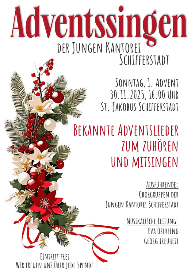 Mit warmen Klängen und bekannten Adventsliedern lädt die Junge Kantorei Schifferstadt am 1. Advent, Sonntag, 30. November 2025, um 16 Uhr in die St. Jakobus Kirche in Schifferstadt ein.