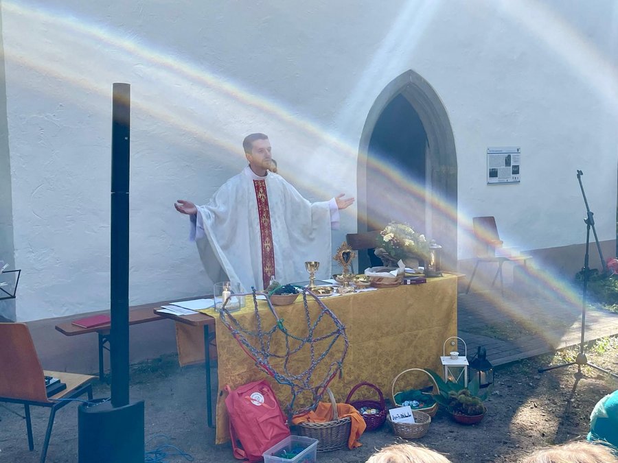 Alle fünf Gemeinden gestalteten durch Beiträge den Gottesdienst an der Michaelskapelle zum Thema "Miteinander auf dem Weg" zusammen mit den Kita's der Pfarrei, die eine eigene Kinder- Wort-Gottes-Feier anboten. Zu Beginn des Gottesdienstes wurde die neue Pastoralreferentin Sandra Petrollo-Shahtout von Pfarrer Matthias Schmitt eingeführt und von Kindern interviewt, um sie besser kennenzulernen. Die Kolpingkapelle Deidesheim und eine Gitarrengruppe aus Erzieherinnen der Kita's umrahmten den Gottesdienst musikalisch.