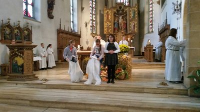 "Gott sei Dank - sind wir hier" begrüßte Kaplan Michael Kapolka die Gemeinde am heutigen Erntedanksonntag. Danke sagten wir heute nicht nur für die vielen Erntegaben, die der reichlich geschmückte Altar uns vor Augen führte. Gedankt hat Kaplan Kapolka auch den drei (von vier) neuen Messdienern, dass sie sich für den Dienst am Altar als Messdiener haben rufen lassen. Von den beiden Gruppenleiterinnen Cosima Zickgraf und Anna Benz, die sie in den letzten Wochen auf ihren Dienst vorbereitet haben, bekamen die drei Mädchen ihr Gewand angelegt und ihre Plakette überreicht. Viele Messdiener waren dabei, um die neuen Minis willkommen zu heißen.