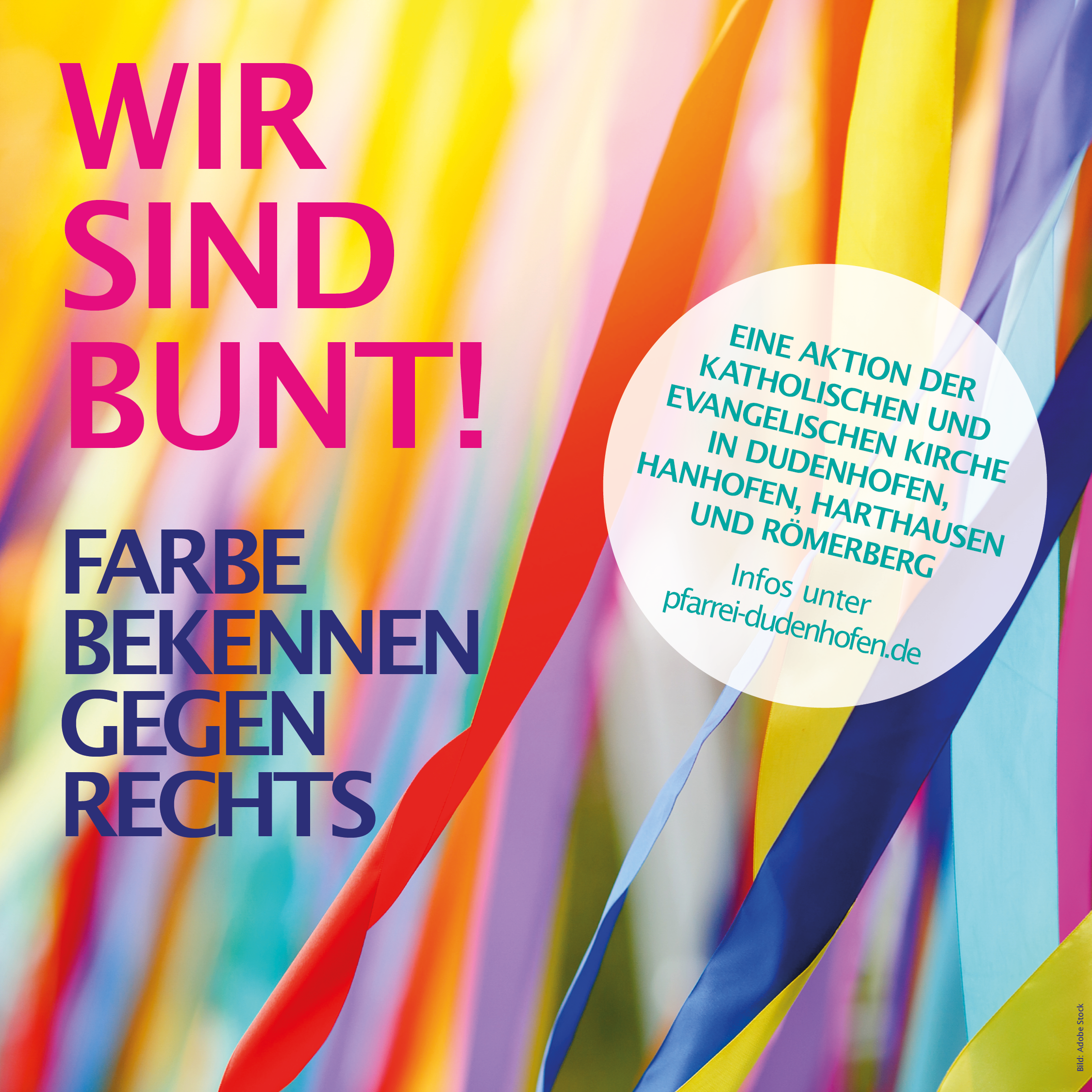 Wir wollen Farbe bekennen gegen rechts. Daher werden ab Samstag, den 27. Januar, an all unseren Kirchen Banner mit dem Slogan der Aktion "Wir sind bunt! Farbe bekennen gegen rechts" hängen. Mit Plakaten an unseren Einrichtungen machen wir zusätzlich auf die Aktion aufmerksam. Dabei soll es aber nicht bleiben. Wir wollen unsere Dörfer sichtbar zu bunten Orten machen und dafür brauchen wir Viele, die gemeinsam mit uns Farbe bekennen.