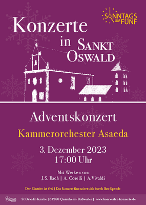 Am 1. Adventssonntag präsentiert die Konzertreihe "Sonntags um fünf" in St. Oswald ein besonderes Highlight: das Kammerorchester "Asaeda" und den ehemaligen Konzertmeister des Nationaltheaters, Nobuhiko Asaeda. Das Streichensemble präsentiert Musik des Barock, darunter den "Winter" aus den Vier Jahreszeiten von Antonio Vivaldi und das Doppelkonzert d-Moll für zwei Violinen von Johann Sebastian Bach. Wie im letzten Jahr werden außerdem Adventslieder für einen stimmungsvollen Einstieg in die Adventszeit sorgen.