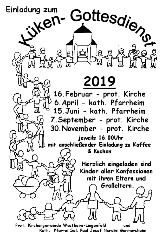 Die Kleinsten sind mit ihren Familien waren zum Kükengottesdienst am Samstag, den 6.April. um 16Uhr ins kath. Pfarrheim Lingenfeld eingeladen. Viele sind gekommen um die Geschichte von Jesu Tod und Auferstehung zu hören. Im Anschluss gab es wieder für alle leckeren Kaffee und Kuchen. Die Kleinen durften malen und basteln!