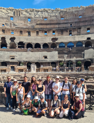 Der nächste Morgen begann früh: Wir trafen uns um 7:20 Uhr in der Hotellobby und machten uns auf zu einer kleinen Zeitreise in die Vergangenheit. Wir wollten nämlich an diesem Tag das alte Kolosseum besichtigen, das 450 Jahre lang als Arena genutzt wurde und in dem insgesamt 1 Millionen Tiere und 400.000 Menschen starben. Um neun Uhr dort angekommen durchquerten wir mit kleinen Hindernissen die Sicherheitskontrolle und fanden uns dann auf den oberen Rängen wieder. Wir umrundeten mit kleinen Gruppen in zwei Stunden den Zuschauerring und machten am Ende noch ein Abschlussfoto. Neben dem Kolosseum befand sich das alte römische Zentrum für Wirtschaft und Politik, das Forum Romanum. Da es in der Eintrittskarte für das Kolosseum mit inbegriffen war, und wir eh vor Ort waren, nutzten wir die Zeit und besichtigten dies auch noch gleich. Auf dem Forum konnten wir viele alte Bauwerke, Tempel und Villen erahnen und besichtigen. Auch der alte Konsul Cäsar liegt dort begraben. Von dem Palatinhügel hat man eine hervorragende Sicht über das gesamte Areal. In einem kleinen Restaurant stärkten wir uns anschließend mit Pizza & Pasta. Das Mittagessen konnte an diesem Tag aufgrund der Spenden für alle Wallfahrer und Wallfahrerinnen finanziert werden.