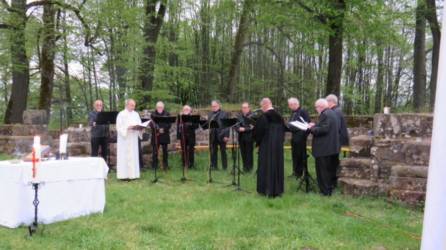 „Vertreten“ wurden die einstigen Zisterziensermönche durch die Schola Cantorum Blieskastel, die unter der Leitung von Matthias Leiner gregorianische Gesänge und Psalmen vortrug. „Es war schon lange ein Anliegen der Schola Cantorum, gregorianischen Choral im Ambiente der Klosterruine Wörschweiler zu singen. Das Abendlob war dafür nun ein hervorragender Rahmen, sodass der Wunsch endlich in Erfüllung gehen konnte. Dank der Technik konnte die Akustik einer halligen Klosterkirche nachempfunden werden - eine wesentliche Voraussetzung dafür, dass das ‚Gänsehautfeeling‘ tatsächlich aufkommen konnte“, freut sich Leiner.