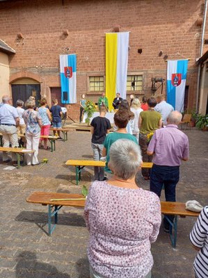 Rund 80 Schwestern und Brüder beider Konfessionen versammelten sich am Sonntag, dem 20. Juni 2021 um 10:00 Uhr im Hof Göbel gegenüber der Kirche in Weitersweiler.