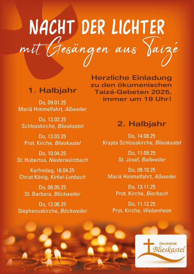 Herzliche Einladung zum ökumenischen Taizé-Gebet im Dezember am 12.12.2024, um 19 Uhr, in der Schlosskirche Blieskastel mit dem Chor Rise & Shine.