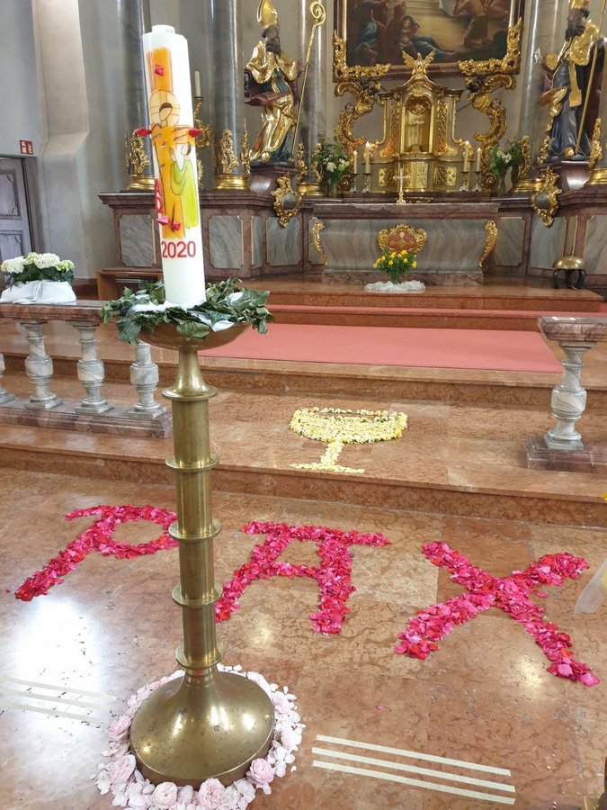 Statt Gottesdienst im Freien und Prozession lud die Gemeinde Dirmstein zum Festgottesdienst in die Laurentius-Kirche. Die "Bastelfrauen" hatten einen wunderschönen und bunten Blütenteppich auf den Mittelgang der Kirche gezaubert, den Abschluss bildete der Begriff "Pax" (Friede) und ein leuchtend gelber Kelch aus Rosenblättern auf den Stufen zum Altar. Auch wenn die zahlreichen Gottesdienst-Besucher nicht singen durften, lies die Orgelmusik und der Gesang einer Schola des Kirchenchors festliche Stimmung aufkommen. Hygienisch verpacktes Kaffeegebäck, am Ende des Gottesdienstes verteilt, sollte die Besucher zu etwas "Home-Pfarrfest" animieren