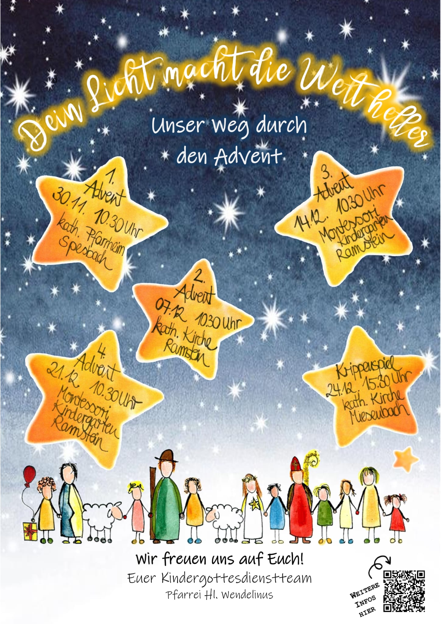 Den 3. Advent (14. Dezember 2025) beginnen wir um 10.30 Uhr im Montessori Kindergarten in Ramstein gegenüber der katholischen Kirche.