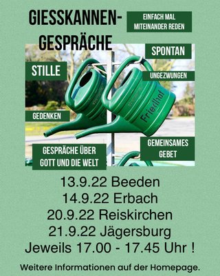 In den Zeiten der Lockdowns und der Beerdigungen „nur“ im Familienkreis ist es besonders auf dem Friedhof in Erbach aufgefallen, dass die Menschen mit einer Gießkanne zum Friedhof gekommen sind, um an den Trauerfeiern teilzunehmen. Schnell ist man über das Thema Gießkanne ins Gespräch gekommen, weil es scheinbar die einzige Möglichkeit war, sich von den Verstorbenen zu verabschieden. Das hat uns auf die Idee gebracht, ein lockeres Gesprächsangebot über „Gott und die Welt“ auf unseren Friedhöfen anzubieten. Wir Seelsorger sind zum spontanen Gespräch oder einem gemeinsamen Gebet am Grab ihrer Angehörigen ansprechbar. Gerne können Sie dafür auch einen Termin mit uns vereinbaren. Die Kontaktdaten finden Sie auf der Rückseite des Pfarrbriefes. Sie finden uns an folgenden Tagen: