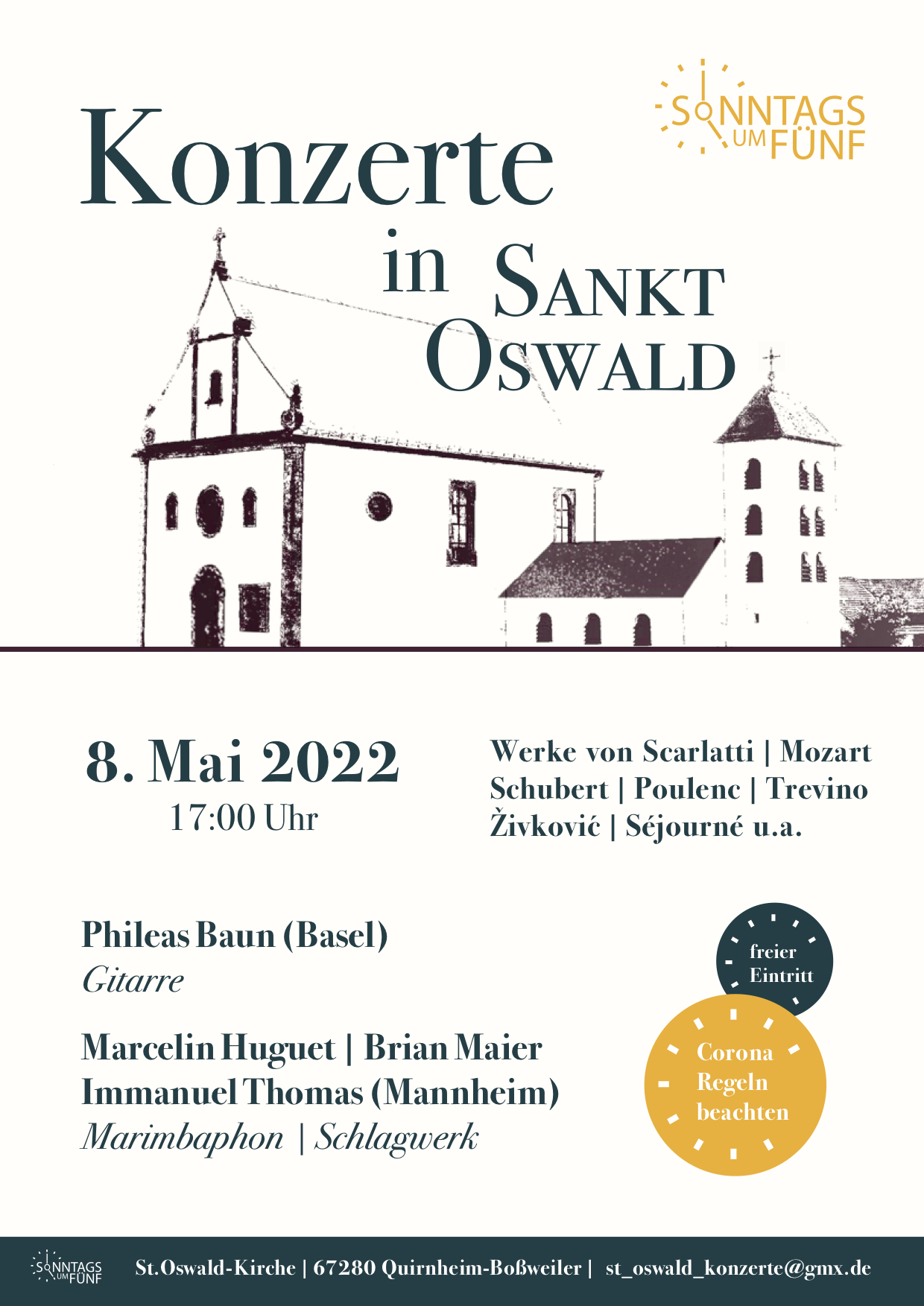 Nun möchten wir einen erneuten Anlauf nehmen, geplant ist das zweite Konzert in der Reihe "sonntags um fünf", Konzerte in St. Oswald, Boßweiler, für Sonntag, den 8. Mai 2022, 17.00 Uhr. Dazu haben wir einen Gitarristen aus Basel, sowie 3 Schlagwerker aus Mannheim eingeladen. Diese vier Instrumentalisten werden mit alter und neuer Musik von, u.a., D. Scarlatti, W.A. Mozart, Fr. Poulenc, H.W. Henze, sowie den Zeitgenossen Ivan Trevino, Nebojsa Zivkovic und Emmanuel Sejourne zu hören sein.