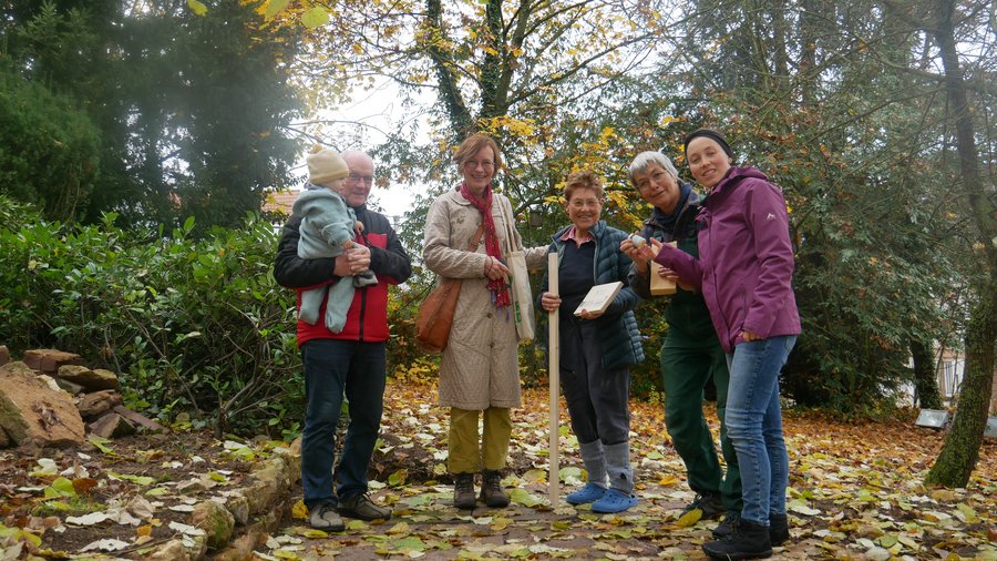 Die protestantische Kirchengemeinde in Rüssingen beteiligt sich am Projekt „Käferkarawane“ der Landeskirche, die auch beratend und finanziell unterstützt. Es geht um den Auftrag, die Schöpfung zu bewahren. Als Kooperationspartner hat sie die katholische Gemeinde und den Natur- und Vogelschutzverein Rüssingen gewonnen. Bereits vor einem Jahr wurde zwischen den beiden Kirchen eine Benjeshecke angelegt, die aber nicht trennt, sondern Lebensraum für die Tierwelt schafft. Zudem sind Nisthilfen und Insektenbrutstätten angebracht worden. Derzeit entsteht ein Begegnungsplatz für Gottesdienstbesucher*innen oder die Gottesdienstkinder auf dem Vorplatz. Die Sonnenuhr, die um 1700 entstand, wurde von Hecken befreit und ist wieder gut einsehbar. Am 15. November 2024 begutachtete die Referentin der Landeskirche, Désirée Winkler, das Geschaffene und überreichte ein Schild, damit Außenstehende auf das Projekt „Käferkarawane“ aufmerksam werden.
