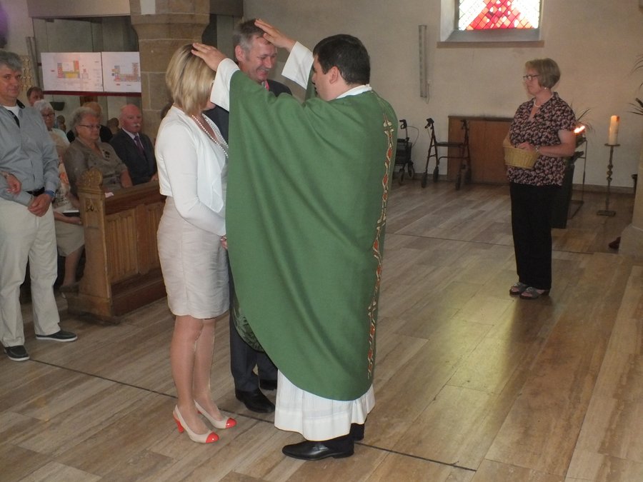 In einem festlichen Dankgottesdienst am Sonntag, 28.06.2015, haben über 20 Ehepaare Gott "Danke" gesagt für 25, 30, 40, 50 und sogar 60 Jahre gelebte eheliche Treue. "Glückliches und gelingendes Leben in Verlässlichkeit - in Ehe und Familie" war das Thema des Gottesdienstes. Ausgehend vom Hohen Lied der Liebe, betonte Kaplan Ševo in seiner Predigt, dass Glaube, Hoffnung und Liebe Grundlagen für ein solches glückliches und gelingendes Leben sind. Der Glaube an Gott, die Hoffnung auf seinen Beistand und die Liebe zu ihm und zueinander machen es erst möglich, dass Menschen auf viele gemeinsame Jahre zurückblicken können. Dies sei ein Zeugnis dafür, dass Glaube, Hoffnung und Liebe ein Leben lang tragen. Nach der Predigt traten die Jubelpaare einzeln nach vorn um den Segen zu erhalten. Als Erinnerung an den Gottesdienst bekam jede Jubilarin und jeder Jubilar einen Schlüsselanhänger mit Kreuz, Anker und Herz - die Symbole für Glaube, Hoffnung und Liebe mit auf den Weg. Nach dem festlichen Gottesdienst organisierte der Gemeindeausschuss Germersheim einen kleinen Empfang auf dem Kirchenplatz um mit den Jubilaren mit einem Glas Sekt auf ihre jahrelange Liebe und Treue anzustoßen.