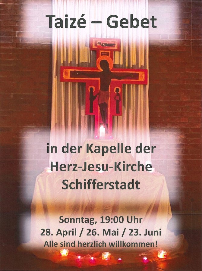 Auch im Dezember wird es wieder ein Taizé-Gebet in der Kapelle der Kirche Herz Jesu (Salierstr. 104) geben. Es findet am Sonntag, 15.12. (3. Advent) um 19:00 Uhr, statt und wird als "Abend der Lichter“ gefeiert". Wie an jedem Samstag in Taizé üblich, erhalten die Mitfeiernden eine Kerze und das Licht wird von Person zu Person weitergegeben. Das Licht wird ausgehen vom "Friedenslicht aus Betlehem", das nach seiner langen Reise an diesem Tag von der Aussendungsfeier im Speyerer Dom (15:00 Uhr) nach Schifferstadt gebracht wird.