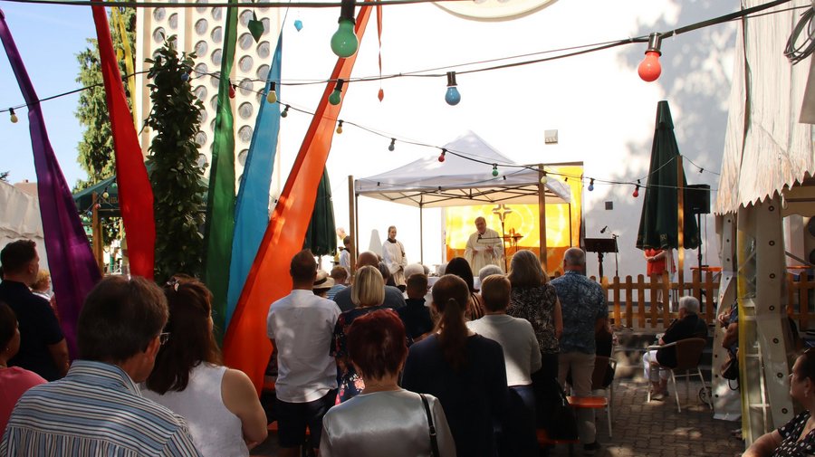 Nach einem ebenso erfolgreichen Samstag begann der Sonntag mit einem Open Air-Gottesdienst. Pfr. Alban Meißner begrüßte vor allem das Ehepaar Marcolongo; die Eheleute konnten am diesjährigen Kerwesonntag ihr 50jähriges Ehejubiläum feiern. Gemeinsam feiern – im Gottesdienst und bei der Kerwe, das ist wahre Gemeinschaft.