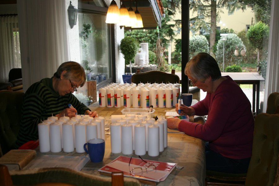 Auch in diesem Jahr haben wir wieder mit 4 Personen ca. 500 kleine Osterkerzen gefertigt, die vor Ostern zu 4,00 € verkauft werden. Die Kosten für die Kerzen trägt die Kirchenstiftung Sausenheim, das Verziermaterial wird privat bezahlt. Somit ist der ganze Erlös für das Sausenheimer Indien-Engagement bestimmt. Es ist eine der 4 Aktionen, mit der wir Geld für unser Projekt erarbeiten. Farblich ist für jeden etwas dabei, gold, silber, rot, grün und blau.