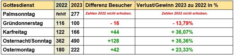 Gottesdienst | 2022 | 2023 | Differenz Besucher | Verlust/Gewinn 2023 zu 2022 in % |