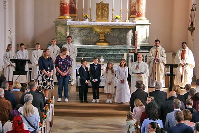 Vom alten Pfarrhaus zogen die aufgeregten Kommunionkinder gemeinsam mit ihren Begleitern in die festlich geschmückte Kirche ein. Der feierliche Gottesdienst wurde von Pfarrer Christoph Herr, Kaplan Praveen Kumar Isukupalli und Gemeindereferent Michael Kolar zelebriert, musikalisch umrahmt von Gudrun Jerges an der Kirchenorgel sowie der Musikgruppe „Begegnung“ unter der Leitung von Gaby Matheis.