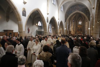 Der Speyerer Bischof beglückwünschte die Verantwortlichen der Pfarrei zu den Visionen, die sie im Blick auf die Klostersanierung aber auch im Blick auf das Zusammenwachsen der drei Gemeinden entwickelt hätten. „Sie haben viel Kraft und Mut investiert, dafür bin ich Ihnen sehr dankbar.“ Für das Zusammenwachsen der Gemeinden war auch das Pontifikalamt selbst ein Beleg: Neben den beiden Chören waren aus allen Gemeinden Messdiener – und Gottesdienstbesucher - nach Germersheim gekommen. Mit Bischof Wiesemann standen das komplette Pastoralteam unter Leitung von Dekan Jörg Rubeck mit am Altar. Außerdem feierten Generalvikar Dr. Franz Jung, Dekan Axel Brecht aus Landau, Domkustos Peter Schappert und der aus Germersheim stammende Pater Hermann Josef Mohr mit.