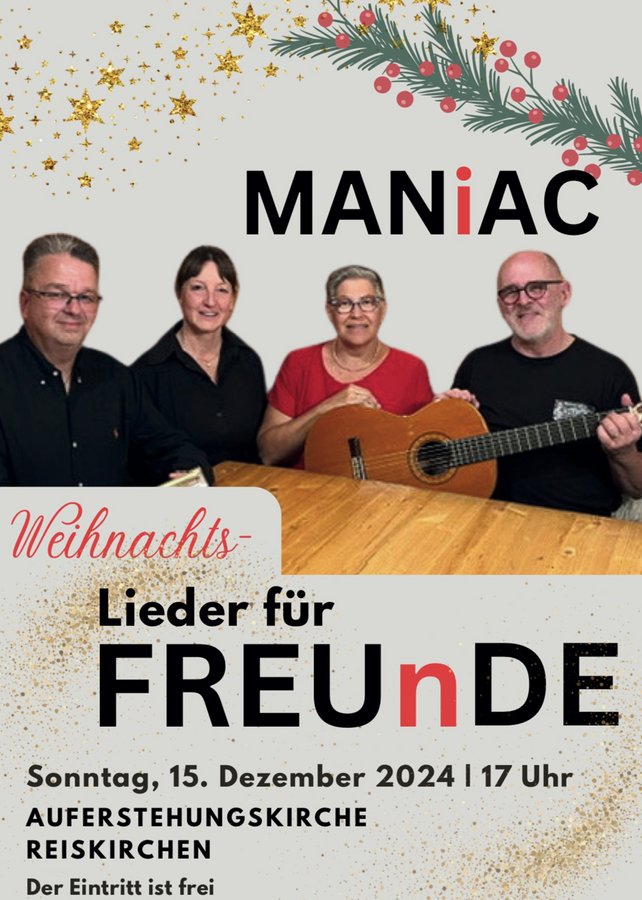 Am 15. Dezember 2024 um 17.00 Uhr lädt MANiAC zum Konzert Weihnachts-Lieder für FREUnDE in die Auferstehungskirche in Reiskirchen ein. Der Eintritt ist frei.