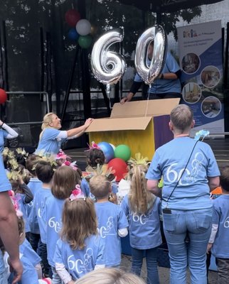 Um 13 Uhr begann die Geburtstagsfeier auf der Bühne, wobei mit einem Stehgreiftheater erst einmal geklärt wurde „Was denn überhaupt hier gefeiert wird“. Nachdem nun klar war, dass es sich um den 60. Geburtstag der Kita handelt und der Geburtstagstisch mit Tischdecke, Blumen und Geburtstagskuchen sowie (Kinder-)Sekt gedeckt wurde, sangen die Kinder Geburtstagslieder und führten einen Löwen- sowie einen Flamingotanz auf. Beide Tänze wurden von einer Kita-Mutter zusammen mit den Kindern eingeübt und an diesem Tag dargeboten.