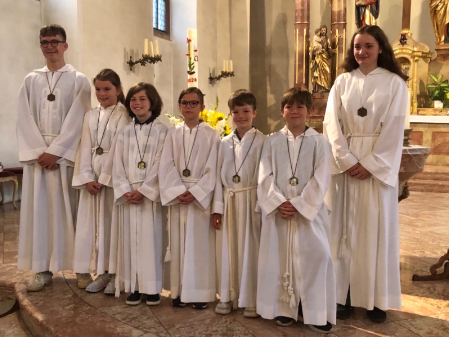 Im Festgottesdienst am Kerwesonntag wurden fünf neue Messdienerinnen und Messdiener durch Pfarrer Nirmaier und Clemens Kiefer offiziell in ihr Amt eingeführt und in den Kreis, der zu diesem Anlass zahlreich erschienenen, Ministranten aufgenommen. Trotz des etwas ungemütlichen, nassen Wetters, zog es doch zur Kaffeezeit viele Besucher*innen in den Hof, die es sich bei Kaffee und Kuchen gut gehen ließen. Gleichzeitig tummelte sich auf dem Kirchenvorplatz die jüngste Generation mit ihren Familien bei zahlreichen Spiel- und Bastelangeboten während die Kinderrockband „Polterweide“ aufgrund des unbeständigen Wetters in der Kirche für gute Stimmung sorgte und den „Kirchengeburtstag“ so richtig fetzig und lustig feierte.
