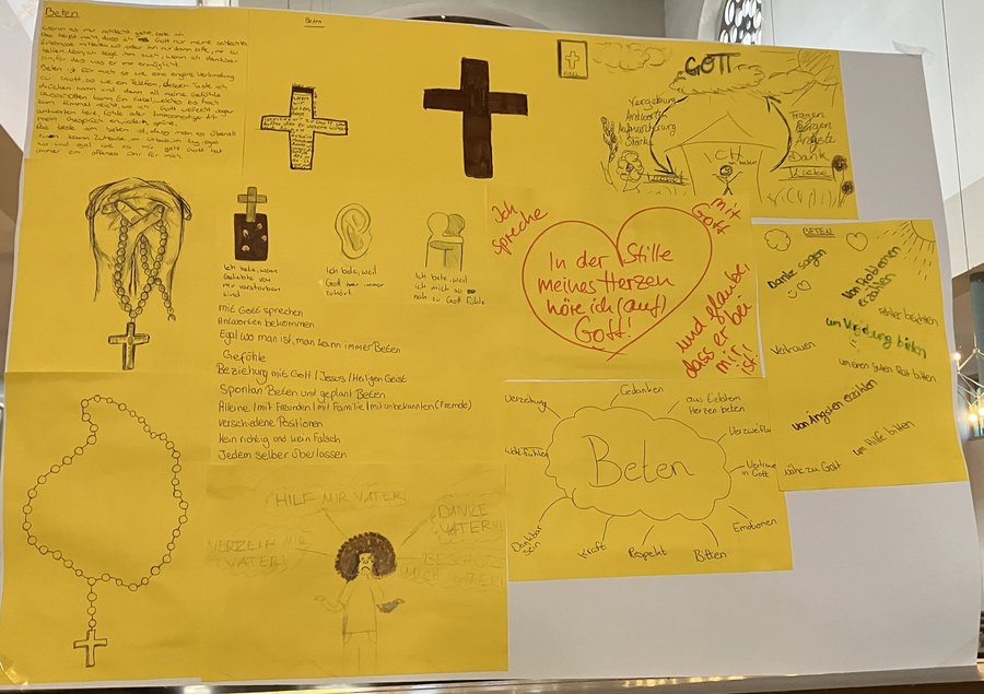Der Firmnachmittag am 16. September 2023 stand im Zeichen des Gebetes: zunächst sollten die Jugendlichen malen oder aufschreiben, was für sie zum Gebet gehört und wie bzw. wo und mit wem sie beten. Darüber wurde sich dann in den Tischgruppen ausgetauscht und die notierten Gedanken bzw. gemalten Bilder je Tischgruppe zu Collagen gefertigt.. Nach einer kurzen Pause wurde aus vorbereiteten Materialien ein Armband mit "Perlen des Glaubens" angefertigt. Jede Perle hat ihre eigene Bedeutung, beginnend bei der goldenen Gottesperle, Perlen der Stille, Taufperle, Beziehungsperlen oder Wüstenperle, um nur einige Beispiele zu nennen.