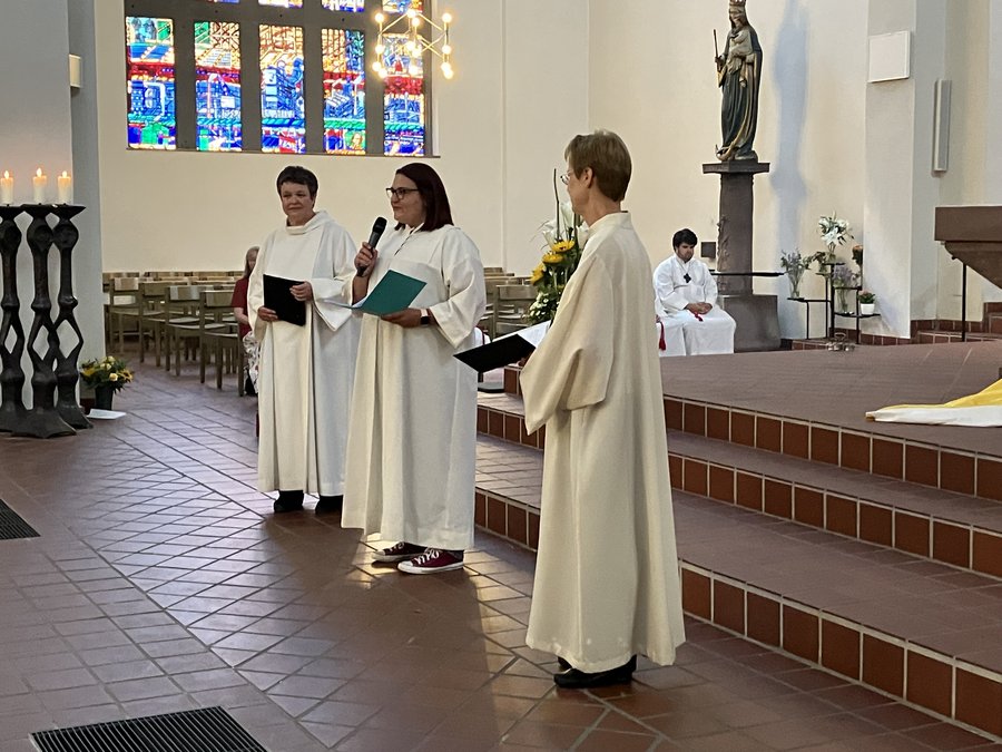 Zum Ende des Gottesdienstes wurde Gemeindeassistentin Alina Menzel verabschiedet. Simone Hartner betonte als Mentorin wie schade es sei, dass die 2jährige Ausbildungszeit bereits vorbei ist. Als Geschenk, an dem sich viele Pfarreiangehörige beteiligt hatten, überreichte sie eine überdimensionale Karte mit vielen guten Wünschen, daneben einen Umschlag mit einem ansehnlichen Geldbetrag. Dieses Geld wird investiert in ein liturgisches Gewand, das Alina Menzel brauchen wird - vielleicht auch irgendwann für liturgische Dienste, die aktuell Frauen noch verwehrt sind.
