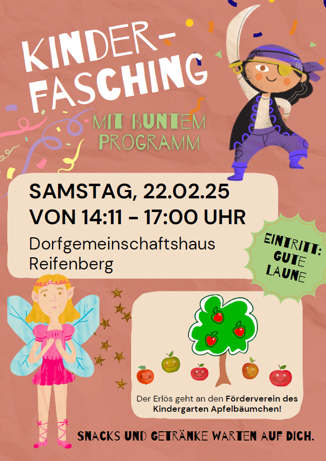 Herzliche Einladung zum Kinderfasching am 22. Februar im Dorfgemeinschaftshaus in Reifenberg. Start des närrischen Treibens ist 14.11 Uhr. Wir freuen uns auf euch.