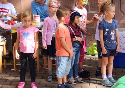 Allen Kindern wurde am Kerwesonntag auf dem Kirchenvorplatz einiges geboten. Nach einem passend gestalteten Familiengottesdienst zum "Kirchengeburtstag" konnte gemalt, gebastelt, gespielt und geirrt werden. Auch viele Erwachsene versuchten sich an den zahlreichen Angeboten. Unermüdliche Künstler verwandelten die Kinder mit Schminke in Feen, Schmetterlinge, Superhelden und vieles mehr. Die Aufführungen eines kleinen Kindertheaters, in dem auch das aktuelle Thema "Vorurteile gegenüber Ausländern" aufgegriffen wurde, rundeten das Programm ab. Ausruhen konnte man sich zwischendurch bei einem leckeren Eis, das von der Kita St. Elisabeth verkauft wurde.