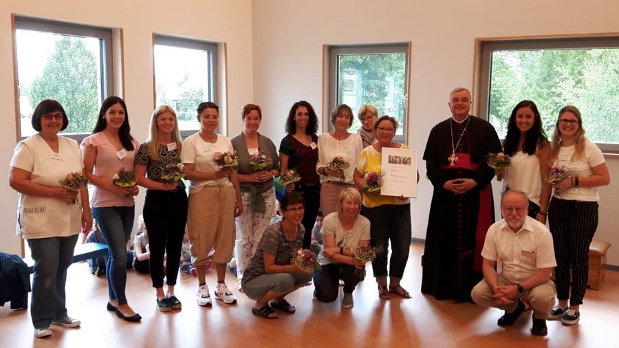 Der zweite Tag begann mit einer Eucharistiefeier in St. Wendelin in Hatzenbühl. Daran schloss sich der Besuch der KITA Arche Noah in Neupotz an. Die einzige KITA der Pfarrei Mariä Heimsuchung hatte im vergangenen Dezember das Audit zum Qualitätsbrief mit Bravour bestanden. Bischof Wiesemann brachte seine Anerkennung und Wertschätzung für das Ergebnis und die Arbeit des Teams zum Ausdruck. Er verlieh dem Team der KITA den Qualitätsbrief. Zu der Verleihung waren auch Bürgermeister Bellaire und der erste Beigeordnete der Ortsgemeinde Neupotz Gerfried Sand gekommen, ebenso Vertreterinnen und Vertreter der Regionalverwaltung, der Fachberatung für KITAs und die pastorale Begleiterin der KITAs auf Bistumsebene.