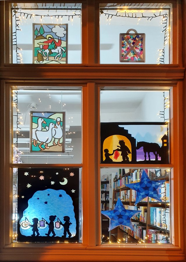 Nun ist schon das 3. Adventsfenster im ehemaligen Schwesternhaus fertig. Im 1. Fenster ist die Verkündigung durch den Engel Gabriel an Maria zu sehen: „ Du wirst einen Sohn gebären, dem sollst Du den Namen Jesus geben“. Maria ist erschrocken, sagt aber ja: „mir geschehe, wie du gesagt“. Dargestellt ist das Geschehen mit biblischen Erzählfiguren. Diese zeichnen sich dadurch aus, dass sie keine Gesichter haben und voll beweglich sind. Gefühle und Empfindungen werden nur durch Körperhaltung und Kleidung dargestellt.Das 2. Fenster hat den hl. Nikolaus zum Thema, der alle Jahre die Kinder erfreut. Im 3. Fenster sehen wir wieder Maria und Josef, die sich mit ihrem Esel auf dem Weg nach Bethlehem gemacht haben. Dieses Fenster ist ganz in den Farben rot und orange gehalten. Hinzu kommen noch die beiden geschmückten Fenster in der Bücherei. Besonders schön ist das Ganze in der Dunkelheit, wenn die Fenster hell erleuchtet sind. Wir wünschen allen viel Freude damit in dieser schwierigen, dunklen Zeit.