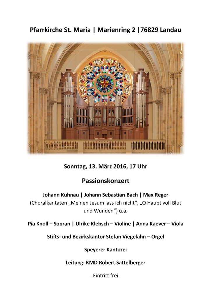 Am Sonntag, dem 13. März wird um 17 Uhr in der Landauer Marienkirche ein Passionskonzert mit hochkarätiger Musik von Johann Kuhnau, Johann Sebastian Bach, Max Reger (Choralkantaten „Meinen Jesum lass ich nicht“, „O Haupt voll Blut und Wunden“) und anderen zu hören sein.