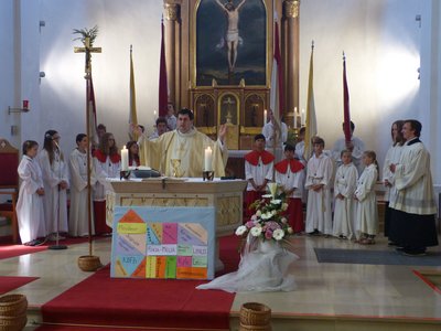 Thema der beiden Gottesdienste war der "Dienst in einer Kirche aus lebendigen Steinen". In seiner Predigt hob Kaplan Ševo die Bedeutung des Dienstes in einer Gemeinde hervor und verwies auf den wichtigen und unerlässlichen Dienst der Messdiener und Messdienerinnen. "Ihr opfert Zeit und Freizeit und steht stellvertretend für die Gemeinde am Altar. Für diesen aufopferungsvollen Dienst - der immer wieder neuen Einsatz erfordert - danke ich Euch allen - auch im Namen der ganzen Gemeinde" - so Kaplan Ševo. Die Gemeinde dankte den jungen Menschen mit langem Beifall. Nach einem Segensgebet über die neuen MessdienerInnen überreichten als Äußeres Zeichen der Aufnahme Mitglieder des Leitungsteams den Neuen eine Plakette bzw. ein Umhängekreuz, welches sie fortan bei ihrem Dienst über dem Ministrantengewand tragen werden.