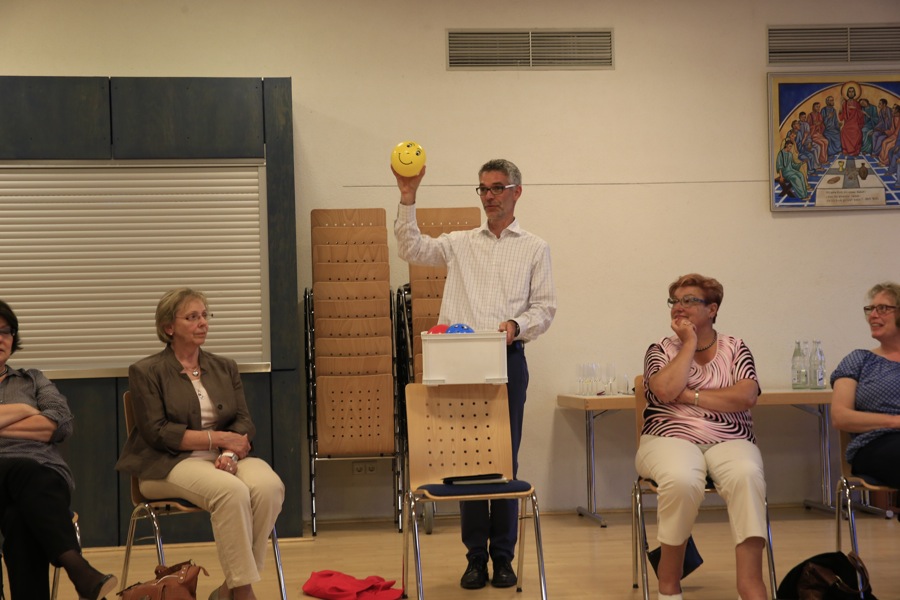 Doch davor stand ein mit Spannung erwarteter Tagesordnungspunkt. Einer nämlich, den die Speyerer so gar nicht geplant hatten. Die Germersheimer wollten rückmelden, wie es ihnen als Projektpfarrei insgesamt ergangen ist mit dem Ordinariat, seinen Mitarbeitern und deren Erwartungen. Das geschieht mittels farbiger Bälle, auf denen lachende, weinende, überraschte, zornige oder ratlose Gesichter gemalt sind. „Manchmal war es zum Haareraufen, wenn man unsere Erfahrungen gar nicht abgefragt hat“, so Pfarreiratsvorsitzende Martina Rieger mit dem schier platzenden roten Ball des Ärgers in der Hand. „Der Termindruck, den wir aus Speyer gemacht bekamen, der ließ manchmal die Luft knapp werden“, stellte Pfarreiratsmitglied Stefan Weis fest. Er hält einen verschrumpelten Ball in seinen Händen. So werden Ärger, Kritik, Lob, Verständnis, Verwunderung und auch Dankbarkeit gezeigt. Doch dann sagt Pfarrer Jörg Rubeck: „Ja, trotz allem, oder gerade deswegen würden wir alle wieder Projektpfarrei sein wollen.“ Das laut hörbare Aufatmen in der Runde stammt von Domkapitular Vogelgesang, und Dr. Kiefer strahlt übers ganze Gesicht.