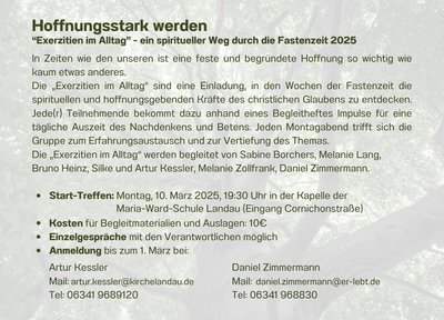 Die Gruppentreffen sind immer montags um 19.30 Uhr in der Kapelle der Maria-Ward-Schule und beginnen am Montag, 10. März. Wenn Sie an den Alltagsexerzitien teilnehmen möchten, können Sie sich gerne bei Artur Kessler anmelden.
