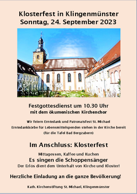 Herzliche Einladung zum Klosterfest in Klingenmünster am Sonntag, den 24. September 2023