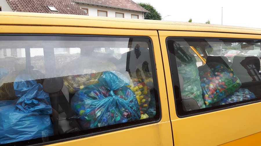 Seit dem Sammelstart an Aschermittwoch des vergangenen Jahres werden in unserer Pfarrei Plastikdeckel für Polioimpfungen im Rahmen eines Projektes des Rotariclubs gesammelt. Bisher konnten dabei in unserer Pfarrei rund 479.000 Deckel, dies entspricht einem Gewicht von 958 kg, gesammelt werden. Heute wurde wieder einmal eine Fuhre Deckel, was unserer Sammlung der letzten sechs Wochen entspricht, zum Zentrallager nach Kaiserslautern gebracht. Das Bild zeigt die gute Füllung unseres Pfarrbusses mit Deckeln. Die Menge die wir heute wegfahren konnten entspricht in etwa 250 kg Deckeln.