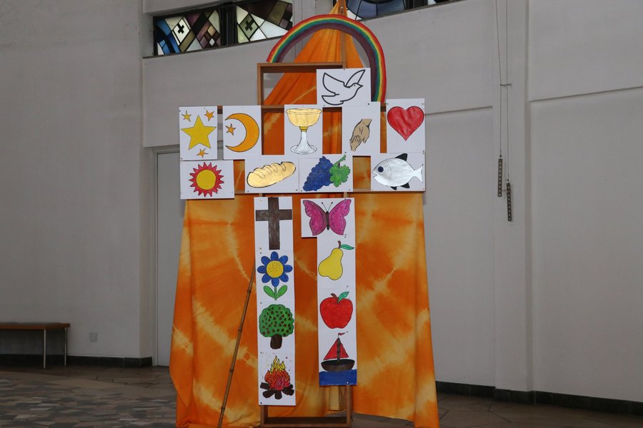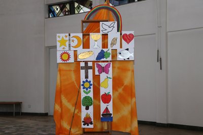 "Immer und überall, immer und überall, immer bin ich da" - das Motto der diesjährigen Erstkommunionfeiern stand im Zeichen der Geschichte von Mose am brennenden Dornbusch als er Jahwe begegnet. Dieser gibt sich Mose zu erkennen und nennt ihm seinen Namen: Jahwe. Das heißt in unsere Sprache übertragen "ich bin der Ich-bin-da". Gott ist auch heute und immer für uns da. Die Kinder hatten dazu bei ihren Gemeinschaftstagen Bilder gezeichnet, die zeigen, wo uns Gott heute immer wieder begegnet. Diese wurden von den Erstkommunionkindern kommentiert. Die Bilder ziehen sich durch die Schöpfungsgeschichte, greifen das Thema Frieden auf und zeigen mit dem Regenbogen, dass Gott seinen Bund mit den Menschen geschlossen hat - auch ein Zeichen, dass Gott immer für uns da ist.
