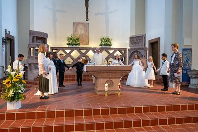 Zum Vater unser versammelten sich die Kommunionkinder um den jeweiligen Altar. Zum Agnus Dei sangen die Kommunionkinder das Lied "Wir stehen hier um den Altar, werden still und leise. Jesus ist nun wirklich da, auf besondere Weise." Der Refrain "Nicht alles können die Augen seh'n, nicht alles kann der Verstand versteh'n. Gott ist in Gestalt von Brot und Wein unter uns." kann zweifelnden Menschen Mut machen, an die Liebe Gottes und seiner Zusage zu uns Menschen zu glauben und zu vertrauen.