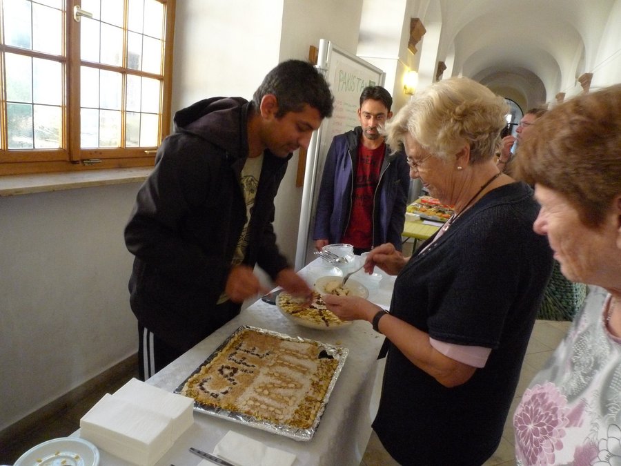Wer am Samstag, 27. September 2014 um 11 Uhr am Pfarrheim vorbei kam, wurde mit einem großen Transparent empfangen, auf dem in vielen Sprachen ein einfacher und herzlicher Gruß stand: Herzlich willkommen! Aber nicht nur das Transparent, auch viele Menschen aus verschiedenen Ländern brachten zum Ausdruck: heute wird es international. Und tatsächlich kamen Bekannte und Fremde zum „Café international“, um einander zu begegnen, miteinander ins Gespräch zu kommen und die leckeren Speisen und Getränke aus den verschiedenen Ländern zu testen. Höhepunkt waren die kulturellen Beiträge zu jeder vollen Stunde. So eröffnete die Gruppe aus Russland (RuDeWe) das Programm mit drei tollen Tänzen und einem Puppentheater „Die Steinsuppe“. Aus Pakistan war Musik der verschiedenen Stilrichtungen zu hören. Syrien tanzte einen klassischen Volkstanz und die Tanzfläche füllte sich mehr und mehr. Venezuela stellte sich mit Hilfe eines Filmes vor. Bunt und lebendig präsentierte sich dieses Land. Zum Schluss wurde noch einmal gesungen. Die Singschar präsentierte sich mit drei Liedern: einem typisch deutschen Volkslied und mit zwei Kirchenliedern.
