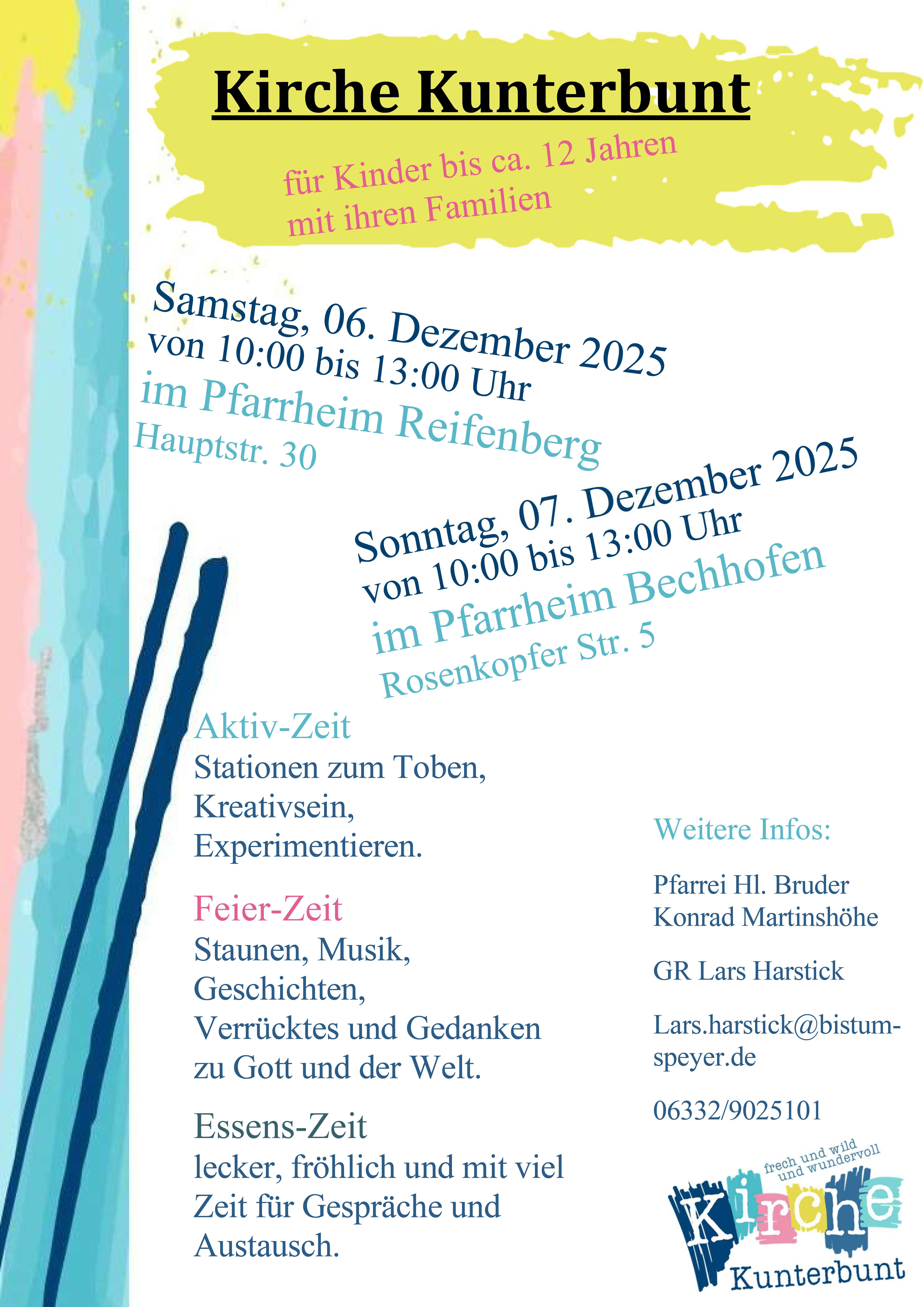Das Team der Kirche Kunterbunt freut sich über viele Interessierte und Besucher. Weitere Infos sind bei unserem Gemeindereferenten Lars Harstick zu bekommen (lars.harstick@bistum-speyer.de, 06332-9025101).